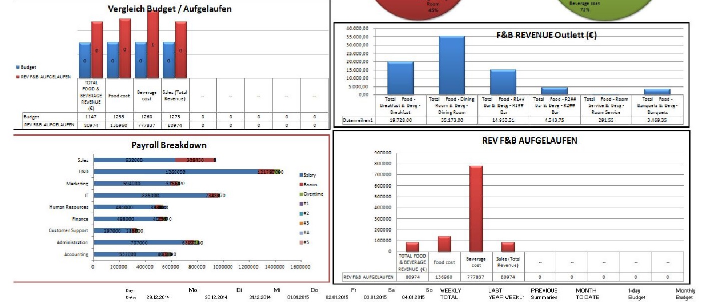 I have found that in addition to supplying labor costs and COGS to managers, taking an open-book approach of sharing this information with all F&B staff greatly improves performance. I advise where the F&B staff will see them everyday. One can show the weekly labor percentage and the other the weekly or bi-weekly COGS. The vertical axis should show ascending percentage and the horizontal axis should indicate the time periods. The target range should also be shown.