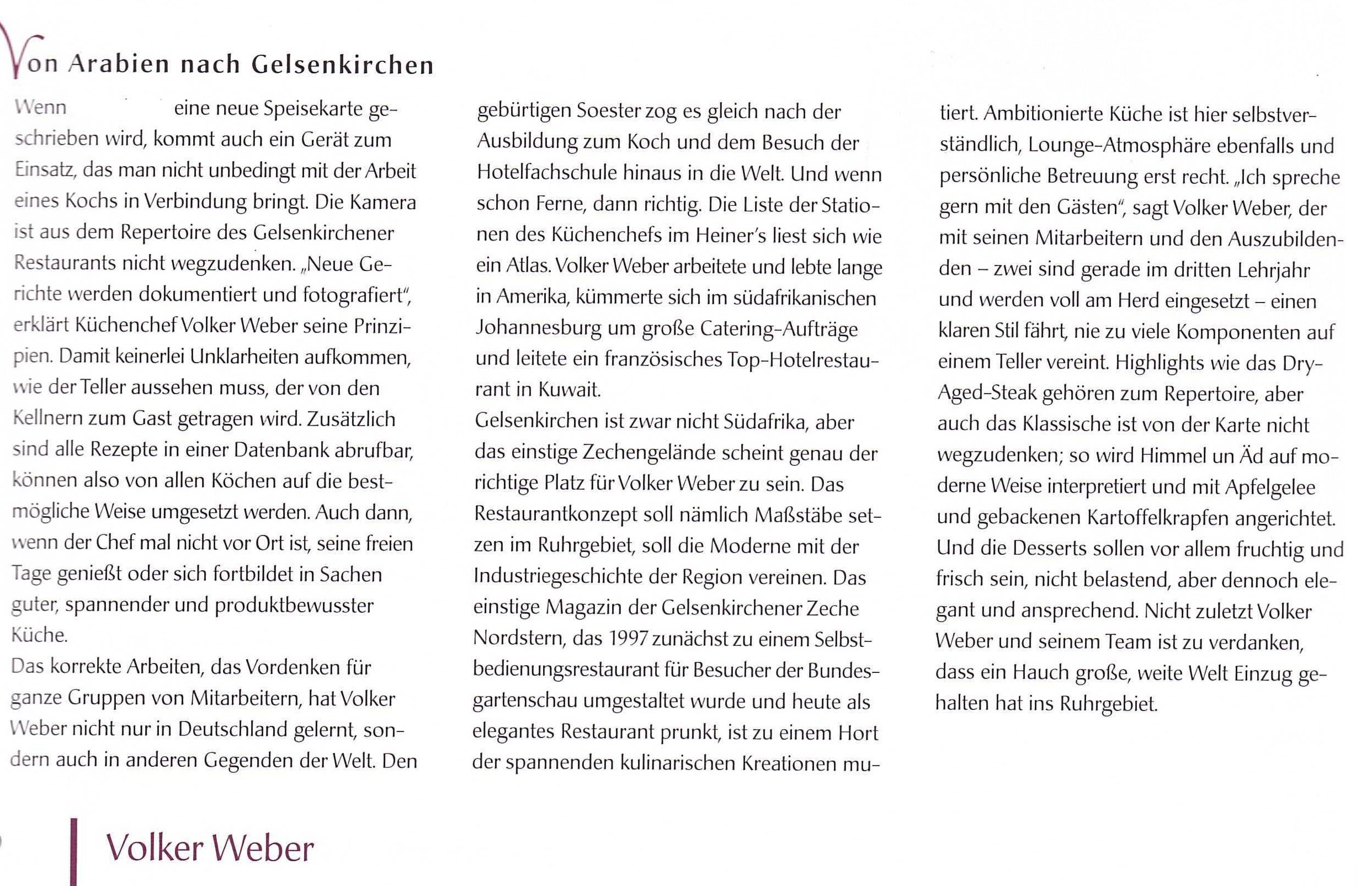 "Top chefs and culinary newcomers in the Ruhr area- this is the name of the new work by Heinz Anschlag and Wolfgang Fassbender. They looked over the shoulders of the artists in the Ruhr area kitchens, including Volker Weber, and were able to elicit one or the other recipe as well as many tricks and tips. What makes the book so exciting are on the one hand the recipes of the culinary artists, the interesting stories and many anecdotes, and on the other hand the high quality photography of the dishes and the regions.
